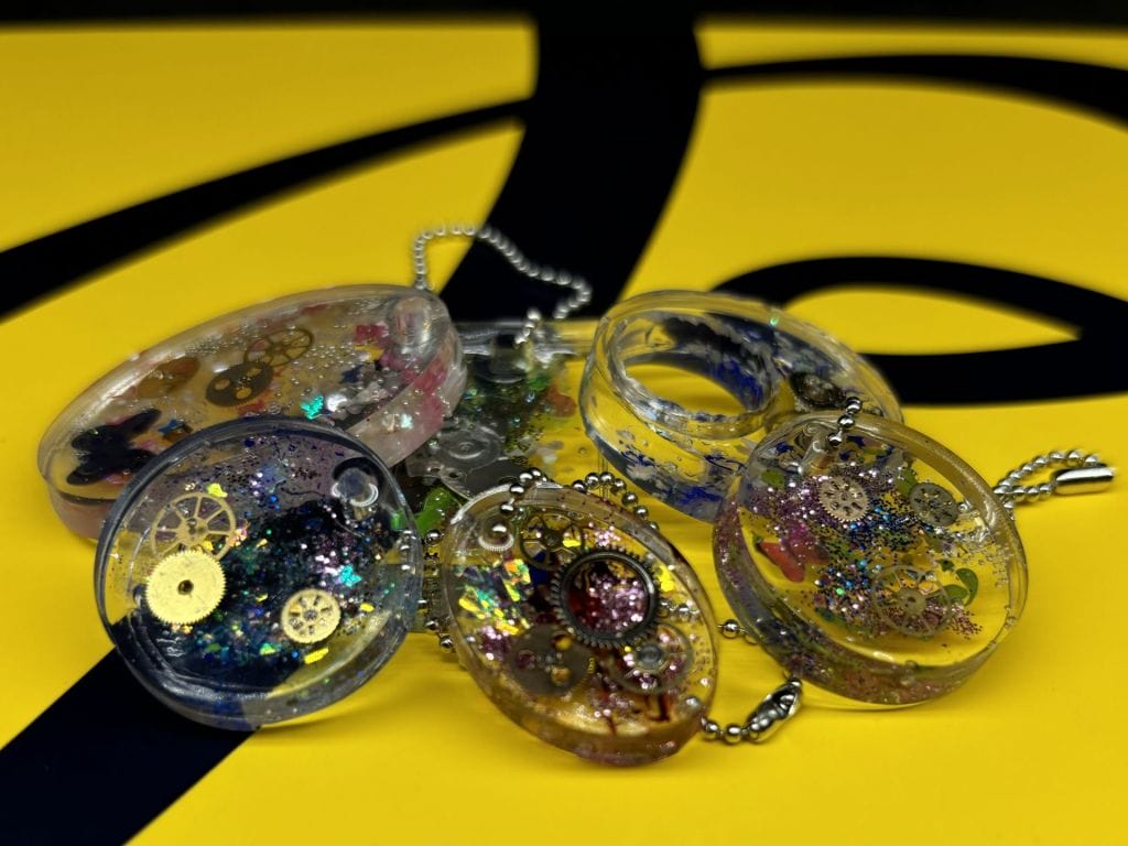 時計のパーツ選びの他にも、キーホルダーの型、色づけやビーズ、ラメなどを選び、そして並べ方も考えたり、楽しみながら環境に対する取り組みに参加してみませんか♪