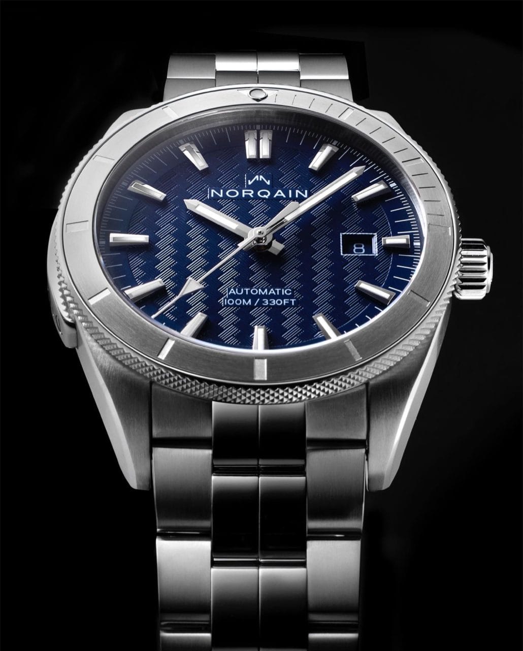 美しいブラック・マザーオブパール文字盤に、バーインデックスやノルケインのロゴにも植字を施しています。