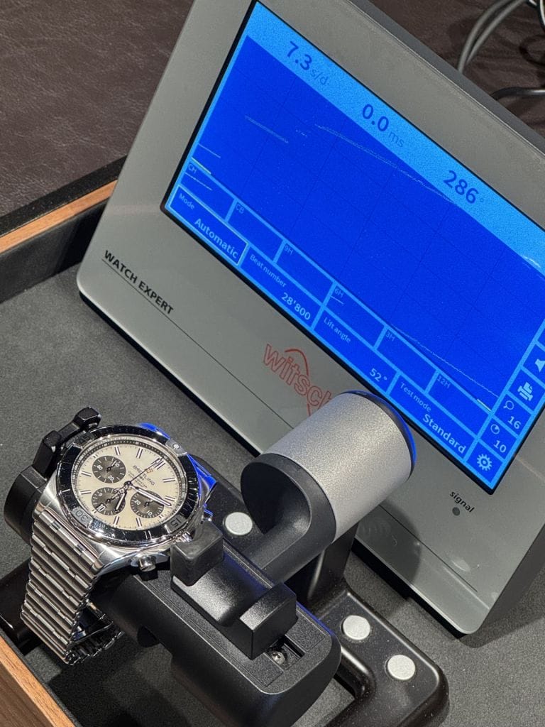 ブライトリングはメーカーからの出荷時にすべての時計が【−4秒〜+6秒】の基準内に収まるように作られております。
