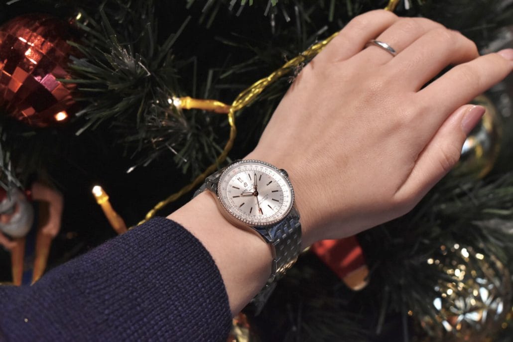 ナビタイマーシリーズ最小のこちらのモデルは、女性の腕元にもジャストフィット