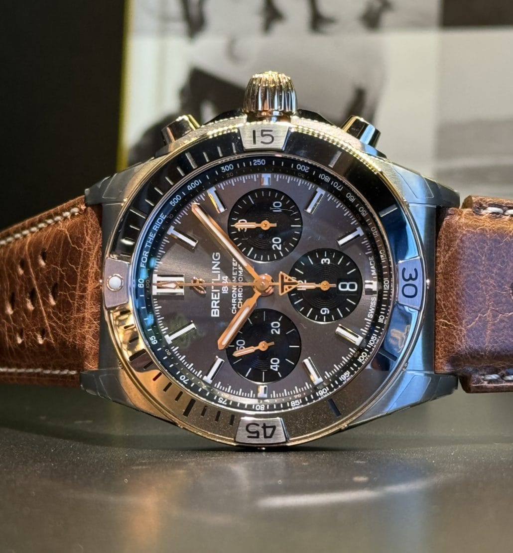 チタンケースに18kレッドゴールドの異素材な趣に上品なアンスラサイト文字盤を搭載し、中央のクロノグラフ針のカウンターウェイトには控えめなトライアンフのシールドロゴ、ケースバックには「Triumph Edition」の刻印が特別感を演出致します。バイク好きにはたまらないですよね〜