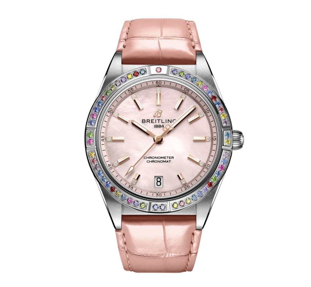 お揃いのアリゲーターストラップ、またはブライトリングを象徴するメタルルーローブレスレットとの組み合わせが可能です。