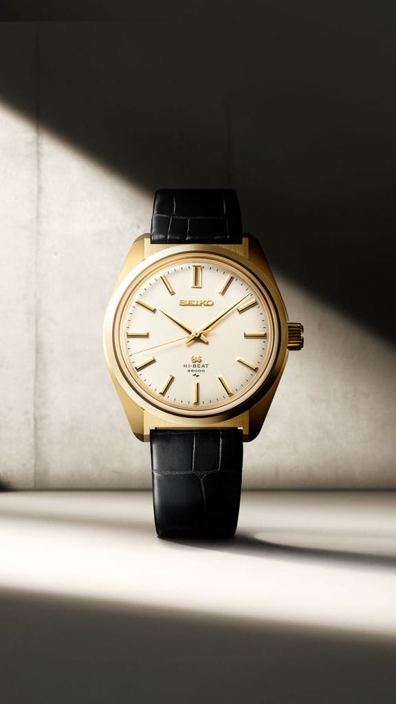1968年に商品化された、ブランド初の10振動手巻メカニカルモデルである「45GS」の復刻デザイン限定モデルが18Kイエローゴールドケース。