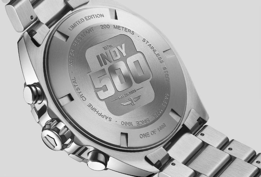 ブラックの固定式タキメーターベゼルには、インディ500のロゴが美しく収められました。