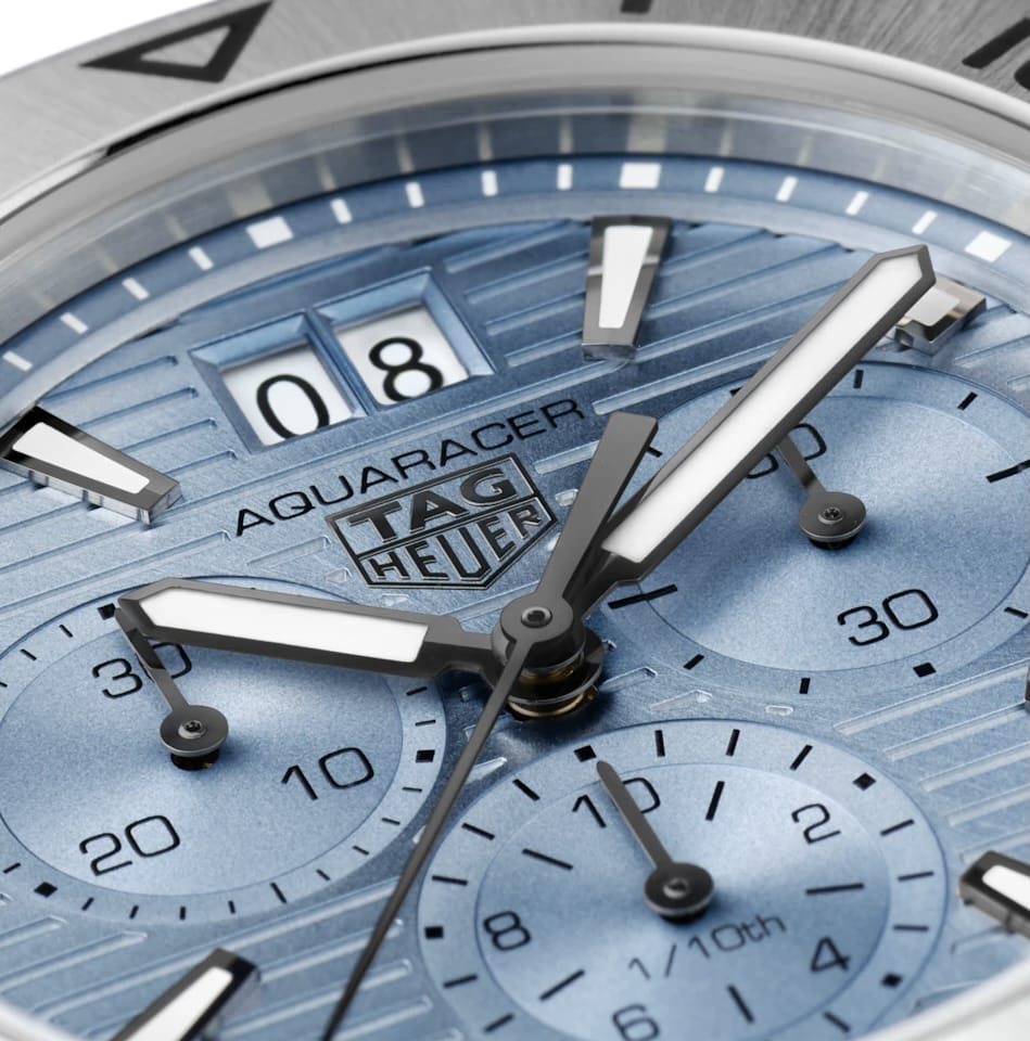 空や氷を連想させるライトブルーのダイアルが、このステンレススティール製タグ・ホイヤー・アクアレーサーの存在を際立たせます!!