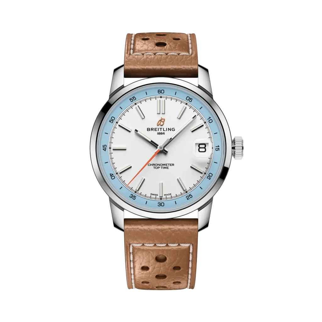 ホワイト×スカイブルーのツートーンは、レーシンググローブを彷彿とさせるパンチング加工のカーフスキンストラップとの組み合わせで、明るく爽やかな印象を与えるモデルとなっております。