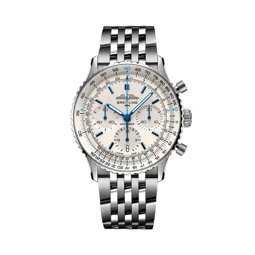 白磁のように美しい文字盤に青針が映える人気モデルで、ナビタイマーにしてはなかなか珍しいカラーリング。