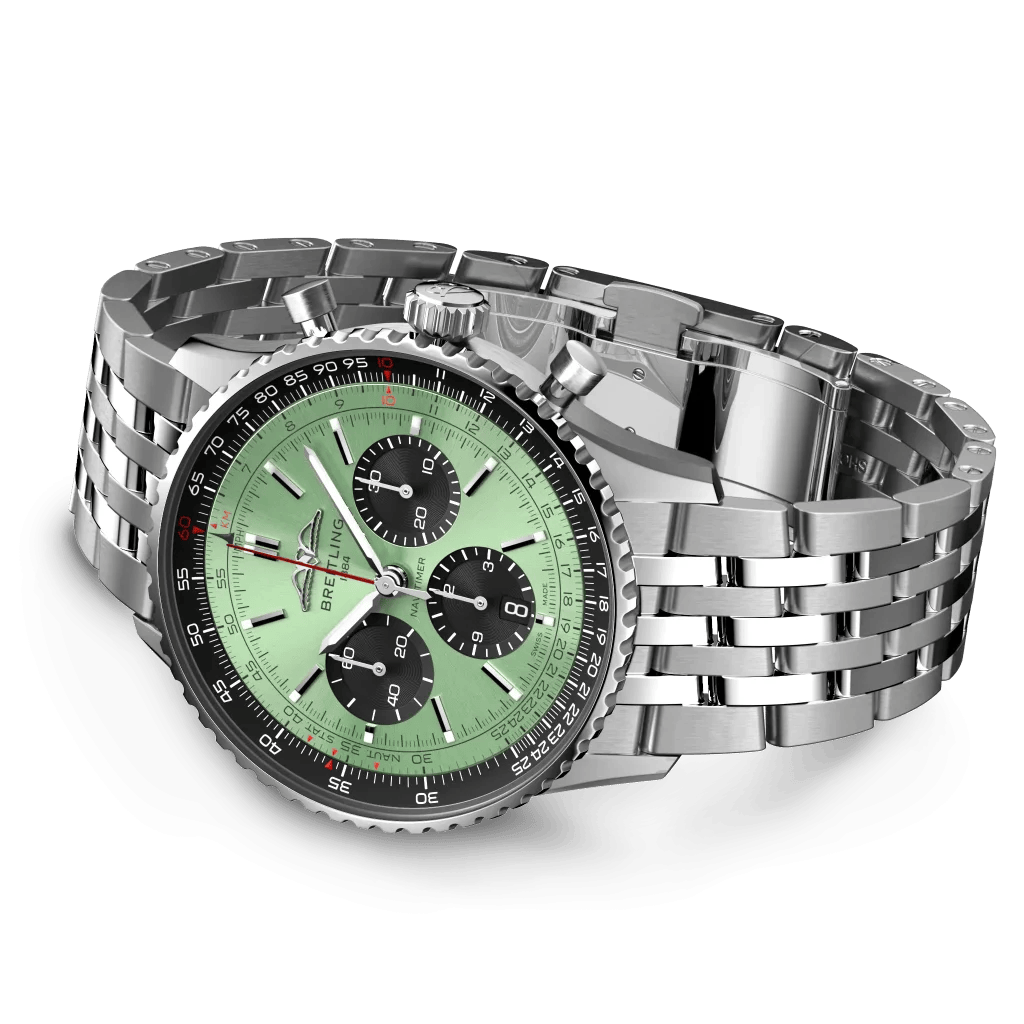 ナビタイマー独自の7連ブレスレットは、サテンとポリッシュのコンビで