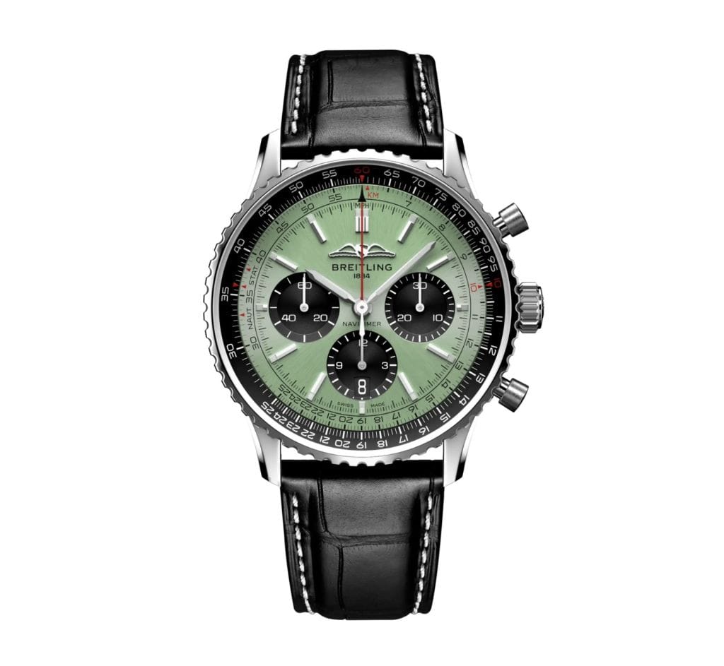ブライトリングのアイコニックなパイロットウォッチ、ナビタイマーのミントグリーン。