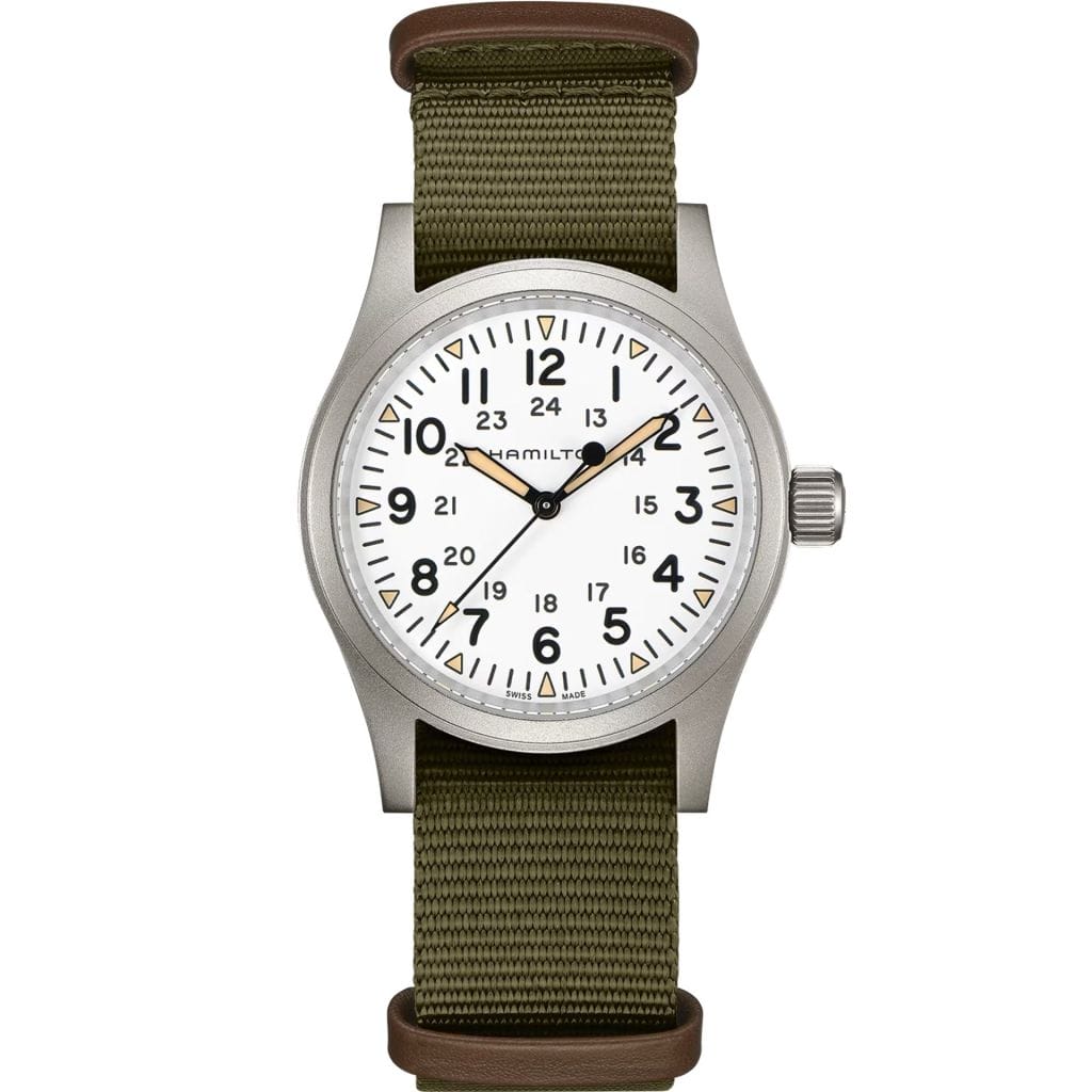 艶消しのステンレスケースにサイズが38mmと収まりのいいカーキフィールドメカ。