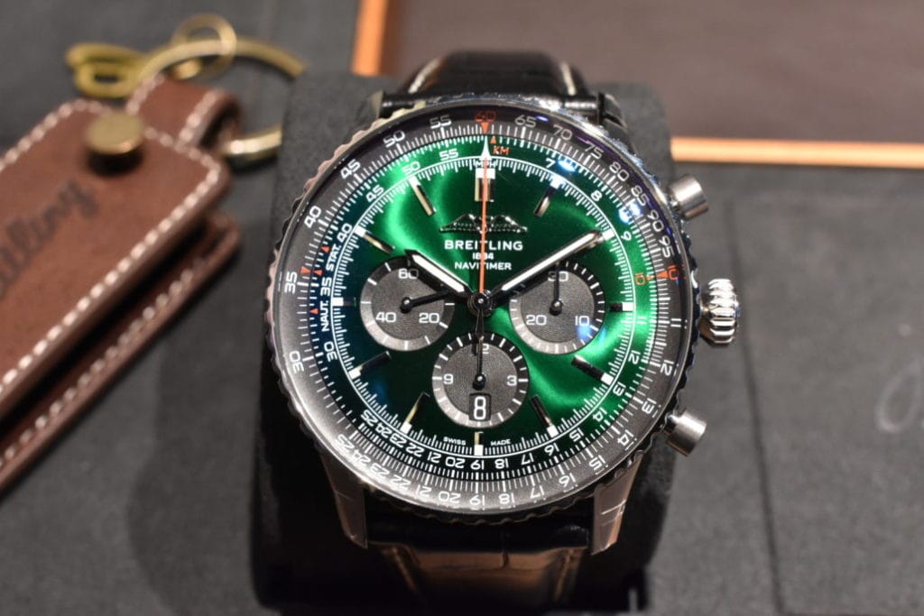 深みのあるグリーン文字盤と12時位置には1950年代に使用されたAOPAロゴが戻り、レトロでモダンな仕上がりになっております。ナビタイマー好きには堪らないですね〜