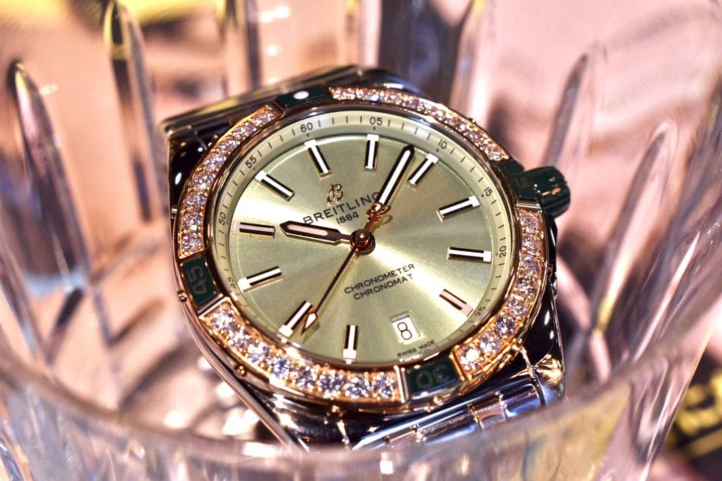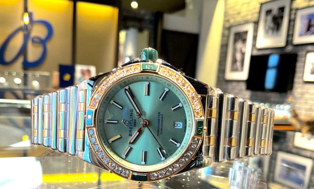 小ぶりな38ミリのケースサイズと男女共に人気なミントグリーン文字盤に18Kレッドゴールドベゼルとダイヤモンドがあしらわれたエレガント且つスポーティーなクロノマットシリーズ。