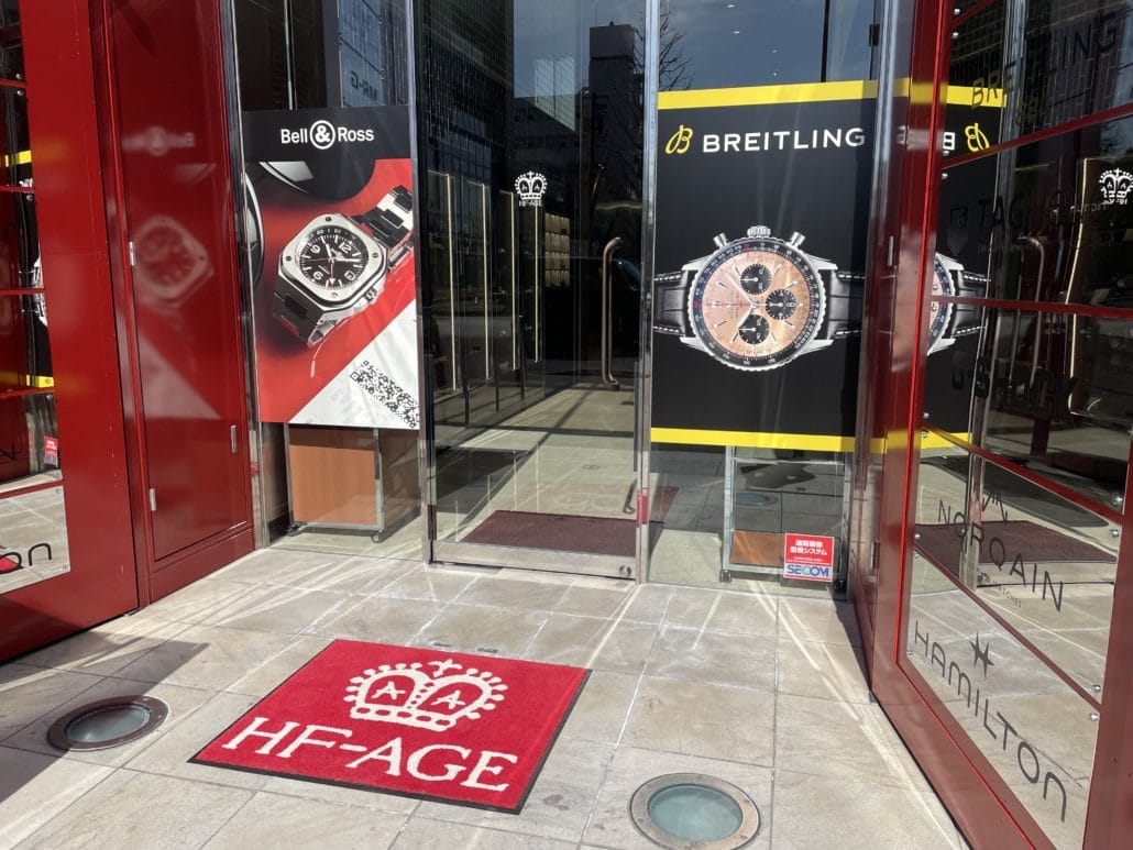 お店の入り口には、ベル&ロス『BR05 GMT』とブライトリング『ナビタイマーB01 クロノグラフ 』のモデルでお出迎えです!