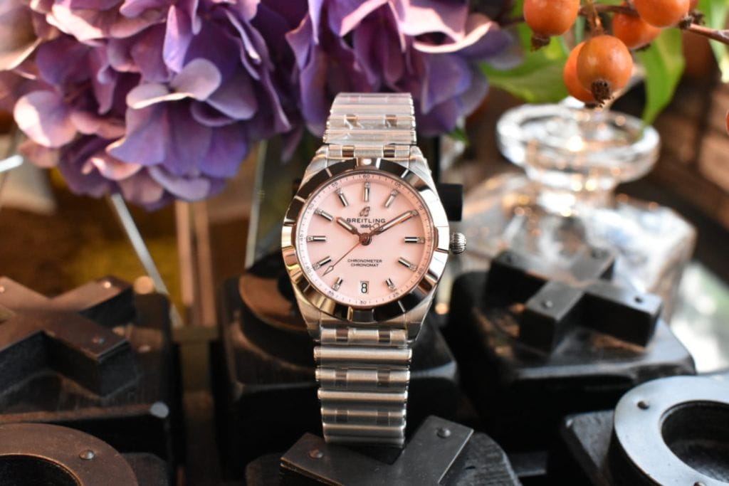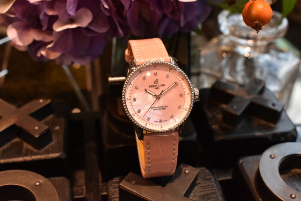 ピンクカラーのMOP文字盤の美しさと可愛らしさはぜひ店頭で。