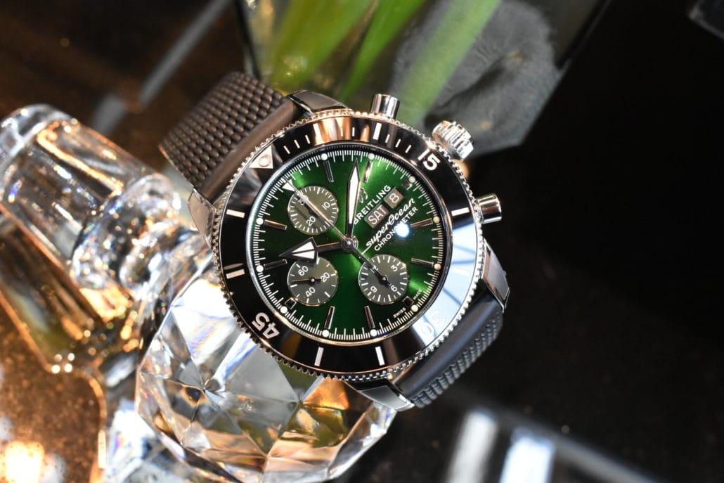 スーパーオーシャンヘリテージはアイコニックな三角針や セラミックリングを備えた逆回転防止ベゼルが特徴です。 こちらのモデルはクロノグラフに加え、 デイ&デイト表示で高い実用性を備えております。 昨今高い人気を誇るグリーンがとても魅力的です。
