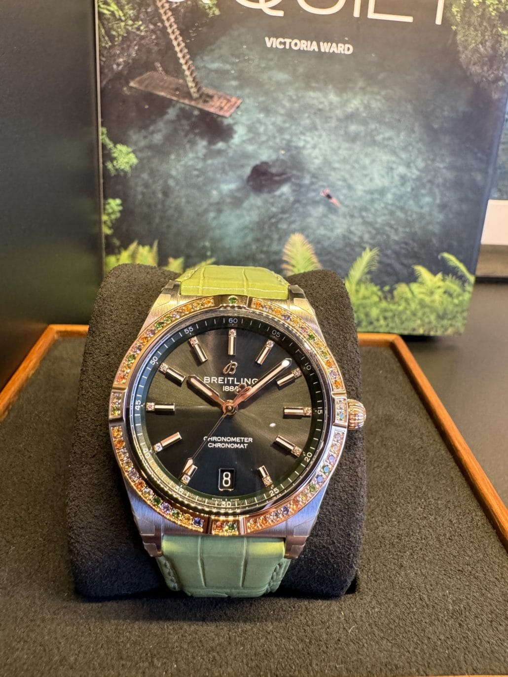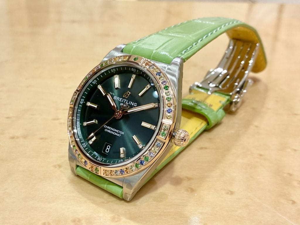 深みのあるグリーン文字盤とカラフルな宝石ベゼルが一際、時計全体をより豪華に引き立たせてくれます。