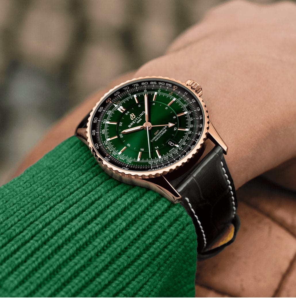 トレーサブルな18Kレッドゴールドケースとグリーンの組み合わせのナビタイマー!