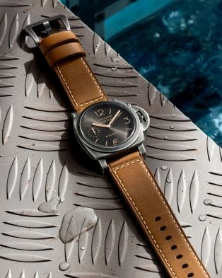 ルミノールPAM01735は、イタリア海軍のために製作されたリファレンス6152/1に着想を得て、47mmケース、トロピカルダイヤル、ドーム型クリスタル、サンドウィッチダイヤルを採用し、当時の個性的なデザインを忠実に再現しています。トロピカルダイヤルは、長年にわたり日光や使用によってブラックダイヤルが徐々に温かみのある色調へと変化したヴィンテージピースに着想を得たものです。47mmケースはイタリア海軍の計器として開発された造形はそのままに、モダンなデザインへアップデートされました。