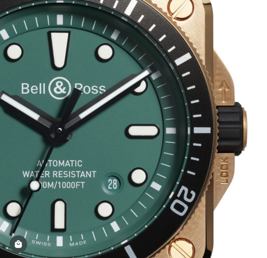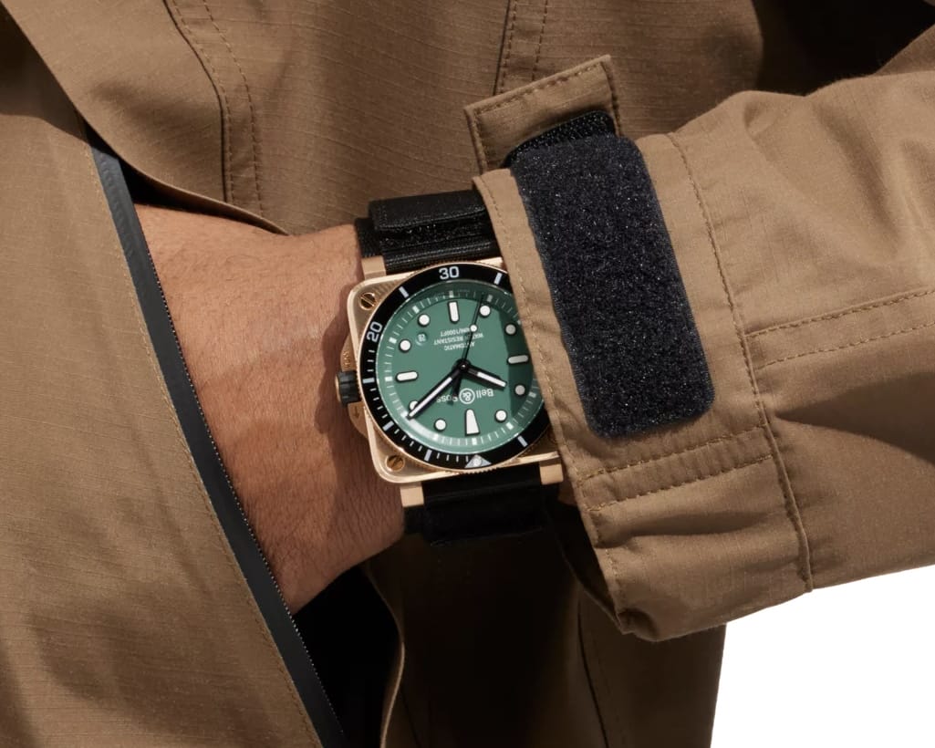 航空機のコックピット計器からインスピレーションを得た四角の中に丸というデザインの角型ケースは、ベル&ロスのアイコンであり