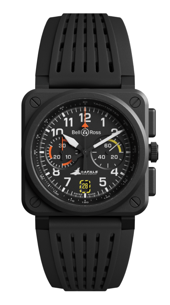 黒地に白のインデックスと視認性も高いクロノグラフになり、文字盤にはラファール戦闘機のシルエットと、日付表示窓の黄色い点線やオレンジ色のクロノグラフ針などといったコックピットから着想を得たグラフィック要素が採用されています。