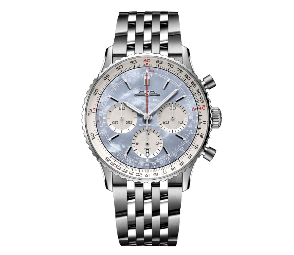 ブライトリングのアイコン的存在となるナビタイマーから、アイスブルーのマザーオブパール(MOP)文字盤を採用した日本限定モデルが登場いたしました