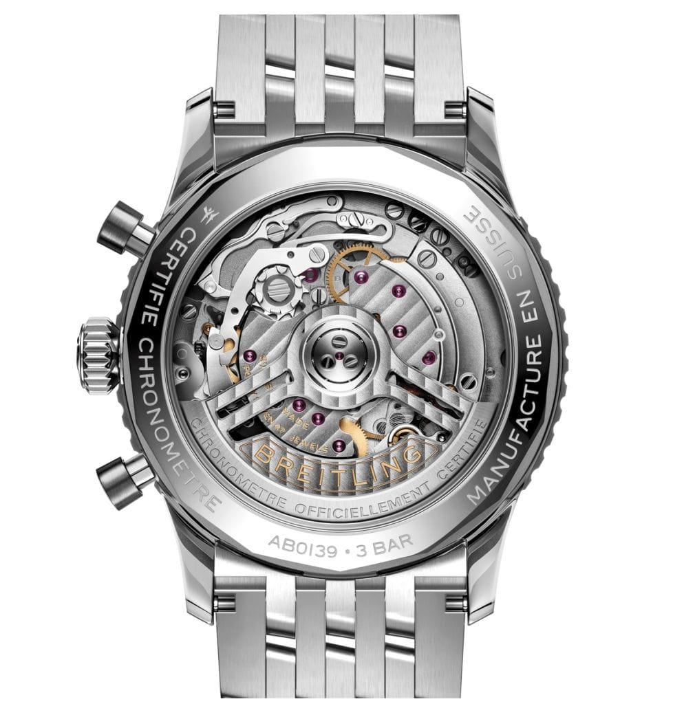 サファイアクリスタルのケースバックからは自社製キャリバー・ブライトリング01をご覧いただけます