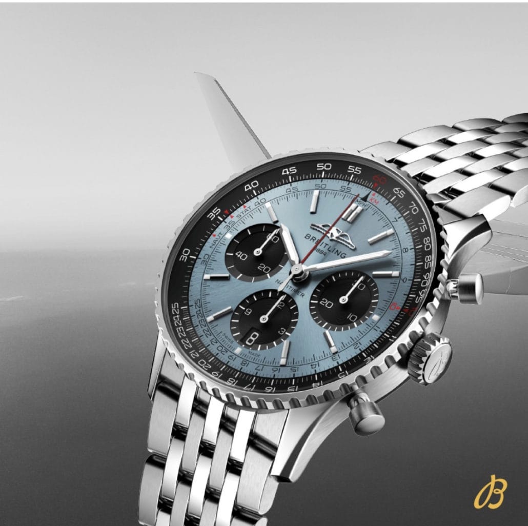ブライトリング人気モデル「ナビタイマーB01クロノグラフ」より41mmのケースサイズのアイスブルー文字盤が今ならなら店頭でご覧頂けます!