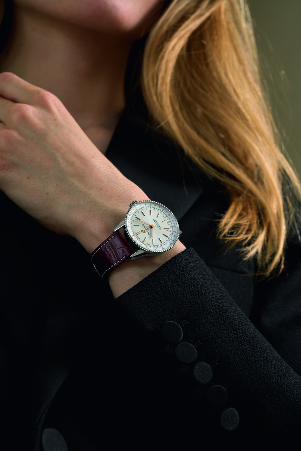 ビーズ装飾のベゼルと回転計算尺により一目でナビタイマーと分かりますね!
