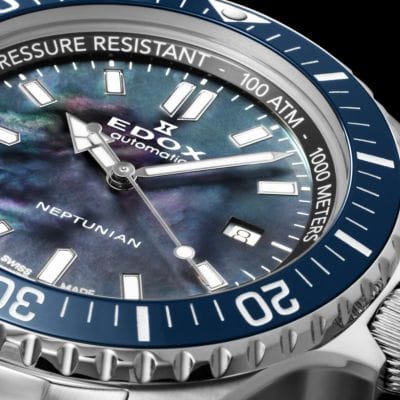 ネプチュニアンの特徴はサファイアと同等の高硬度を持つハイテクセラミックベゼルを使用。また夜光塗料は最上級のスーパールミノバX1が使われ、夜間や水中など暗所での高い判読性を誇ります。