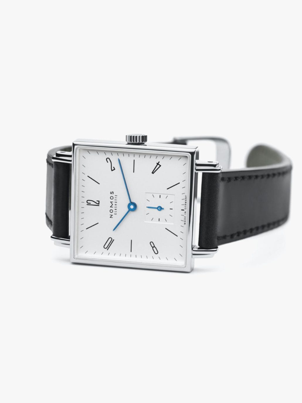 真っ白な文字盤、上品な艶がある黒のストラップ、青焼された針。この3つのカラーが凛々しい印象で、スクエアのケースと合わせるとクラシカルでありながら、存在感はしっかりと主張しています。