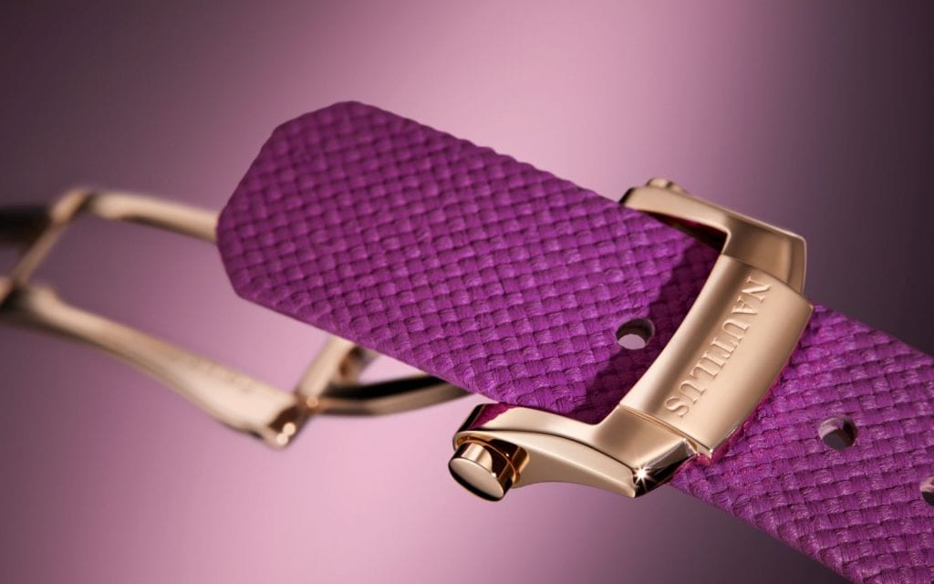 文字盤のカラーに合わせたパープルのコンポジット・バンドは