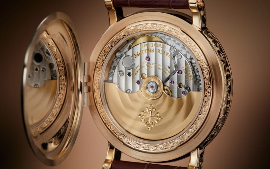 手彫金が施されたヒンジ付きカバーとローズゴールドの折り畳み式バックルが装備されています。