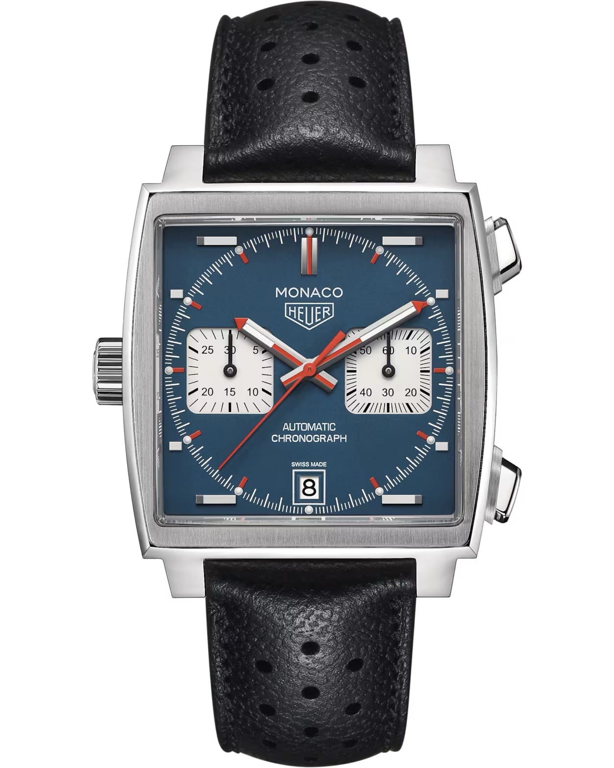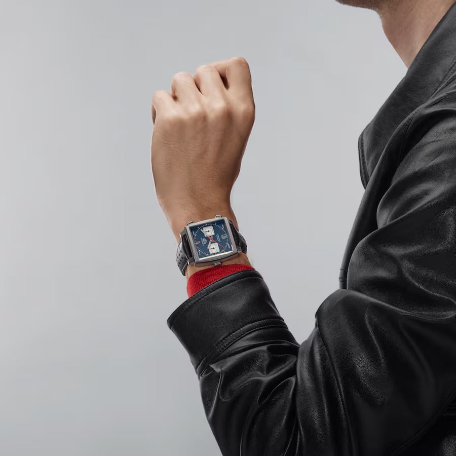 個性的なスクエア型のケースが目を惹くデザイン。世界初の防水性能を備えたスクエア型クロノグラフであるモナコの伝説を象徴するこのデザインは今なおアイコニックであり続けています。
