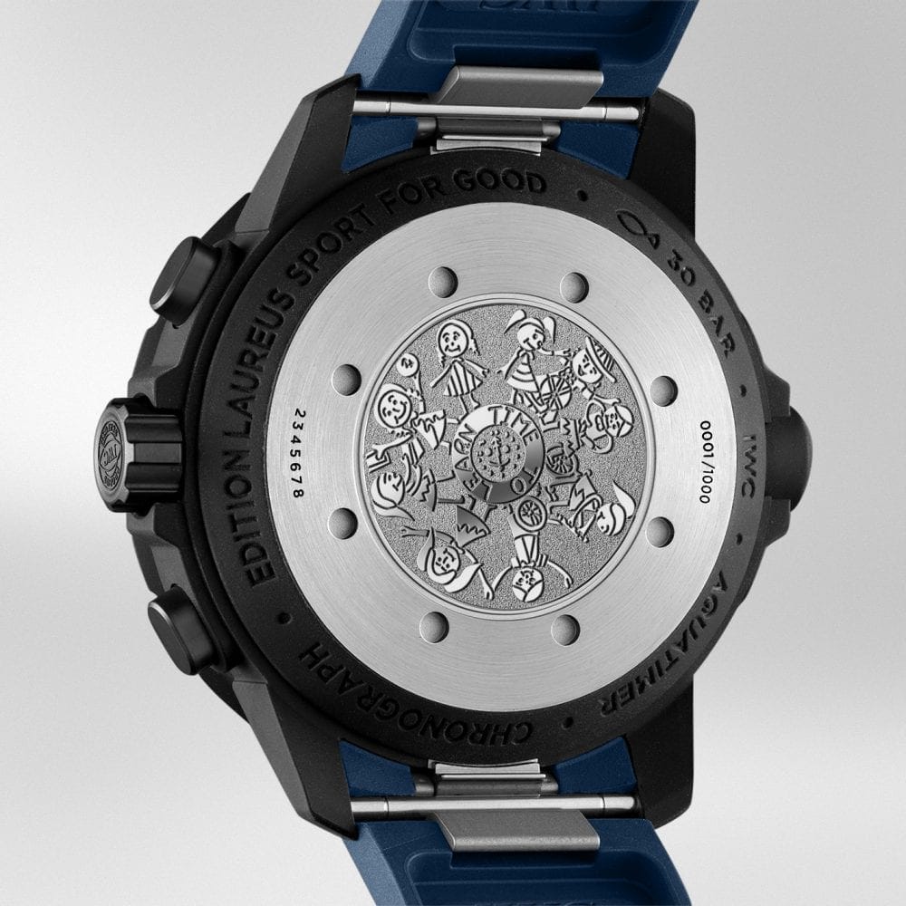 ケースの裏蓋は、15歳のメランが「Time to Learn(学びの時)」というテーマで描いた絵のエングレーヴィングが施されています。これは、IWCがローレウス財団のプロジェクトの一環として毎年開催している絵画コンテストで最優秀賞に選ばれたスリランカの少年の作品です。