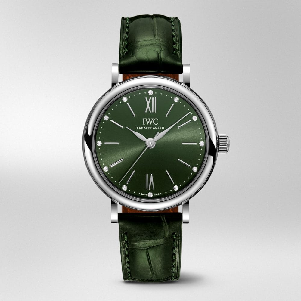 サントーニ社製のグリーンのアリゲーターストラップも高級感たっぷり味わえます