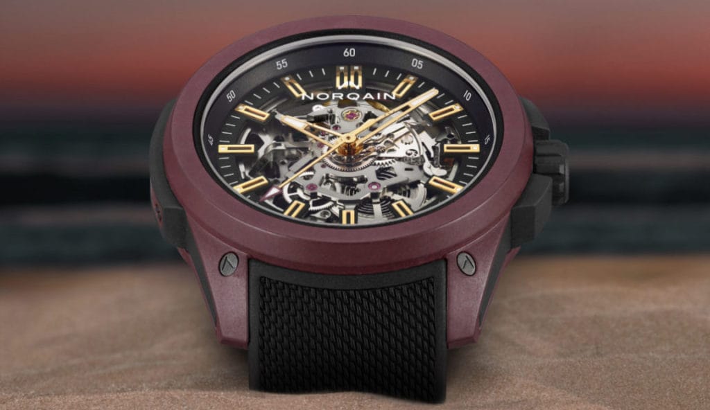 落ち着きのあるバーガンディを基調とした世界限定300本モデル。WILD ONE初のスケルトン文字盤です!