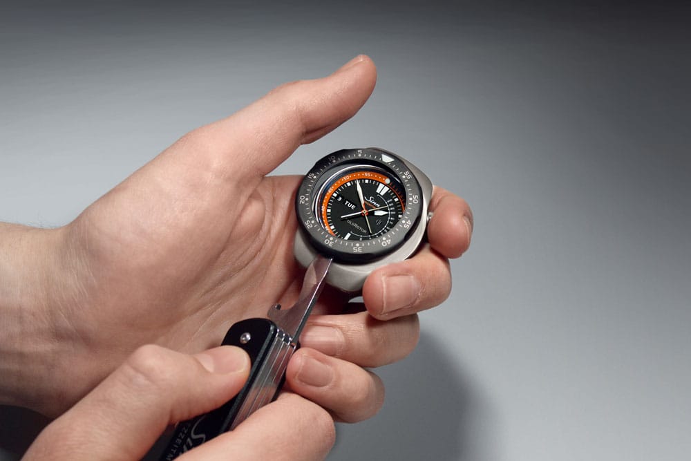ベルトは工具を使用する事なく簡単に取り外し出来、回転ベゼルは付属のポケットナイフのドライバーを使用して