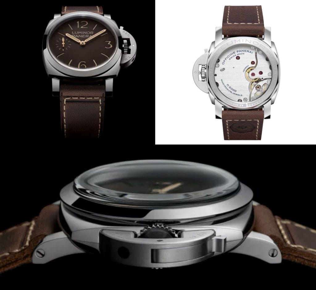 イタリア海軍の水中任務のために開発された1960年代のパネライのルミノールケースは、堅牢な構造と大型の手巻きキャリバーを中心に形作られていました。先程の歴史的ピース「Ref. 6152/1」の構造を再解釈しクッション型の形状ドとーム型クリスタル、そしてリュウズガードを維持しつつこれらの機能的要素を現代的なサイズへと落とし込んだ新作モデルです。