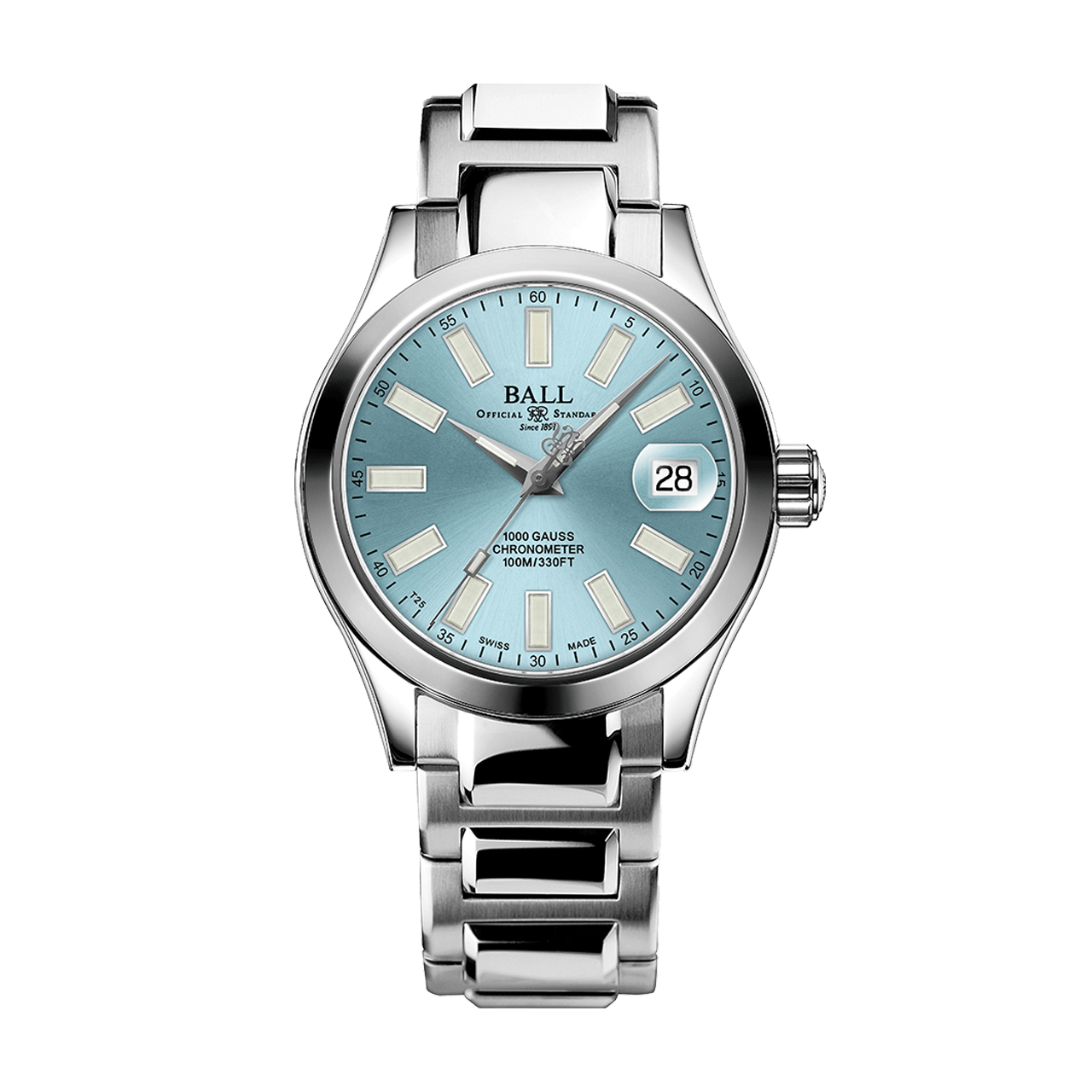 現在最もご好評を得ている「マーベライト クロノメーター」は、ケース&ブレスレットに「904Lステンレススティール」を使用し、ミューメタル製インナーケースの内蔵による「耐磁性80,000A/m」を実現。さらに高精度の証であるスイス公的機関による「C.O.S.C.認定クロノメーター」を取得していることなどが理由に挙げられます。そして今回、これら3つの条件を受け継ぎながら待望の小型化を果たした「マーベライト クロノメーター 36」が誕生しました。魅力的なのが文字盤バリエーションの豊富さで、初期ラインナップでは5カラーを展開予定です。天然素材固有の一点もののプレミアム感と煌びやかさを誇るピンク マザー・オブ・パールと、もっとも汎用性の高いブラック文字盤は、レインボー色のマイクロ・ガスライトを搭載しています。トレンドを巧みに捉えたオリーブグリーン&アイスブルー、そしてレトロシックにぴったりなグラデーションのバーガンディはそれぞれサンレイ加工を施しており、ライトグリーンとイエローで構成した自発光マイクロ・ガスライトを備え付けています。