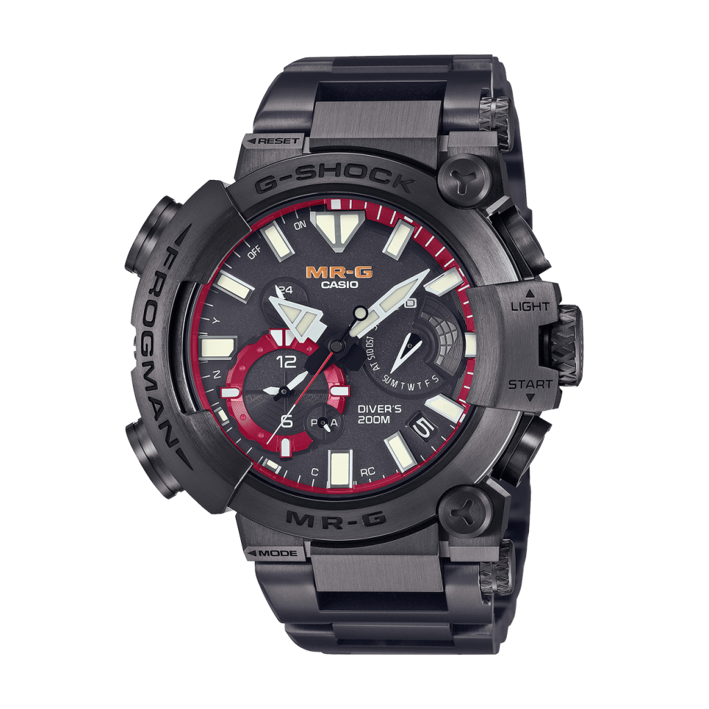 MRG-BF1000は、ISO規格200m潜水用防水機能を持つ本格ダイバーズウオッチ「FROGMAN」にチタン外装を採用し、丹念な仕上げを施したMR-Gです。