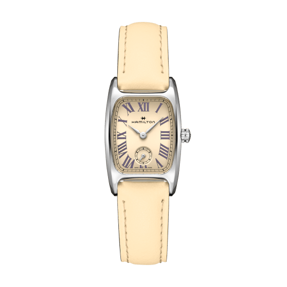 巧みにカーブしたケースシェイプと独特なアールデコスタイルのハミルトンの「ボルトン M」は、定番のマカロンフレーバーに着想を得た大胆なカラーで生まれ変わります。ラベンダーパープルのローマ数字がこのタイムピースの美しいバニラベージュダイヤルを引き立て、ダイヤルと同色のレザーストラップが魅力を高めます。美味しそうなカラーコンビネーションのパレットを採用したハミルトンの「ボルトン」は、手首への魅惑的な甘いご褒美です。伝統と革新が見事に融合したこのタイムピースは、フレッシュでタイムレスな女性らしい雰囲気を醸し出します。