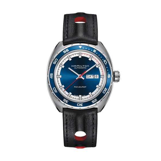 パン ユーロという名を冠しながらも、ハミルトンのルーツであるアメリカンスピリットが息づくクラシカルな佇まい。現代的なスタイルに80時間の標準持続時間を備えた自動巻きムーブメントは止まることなく歩み続けます。視認性の高いデイデイト表示も兼ね備え、落ち着きがありクラシカルなデザイン。NATOストラップまたはレザーストラップを選ぶことができます。