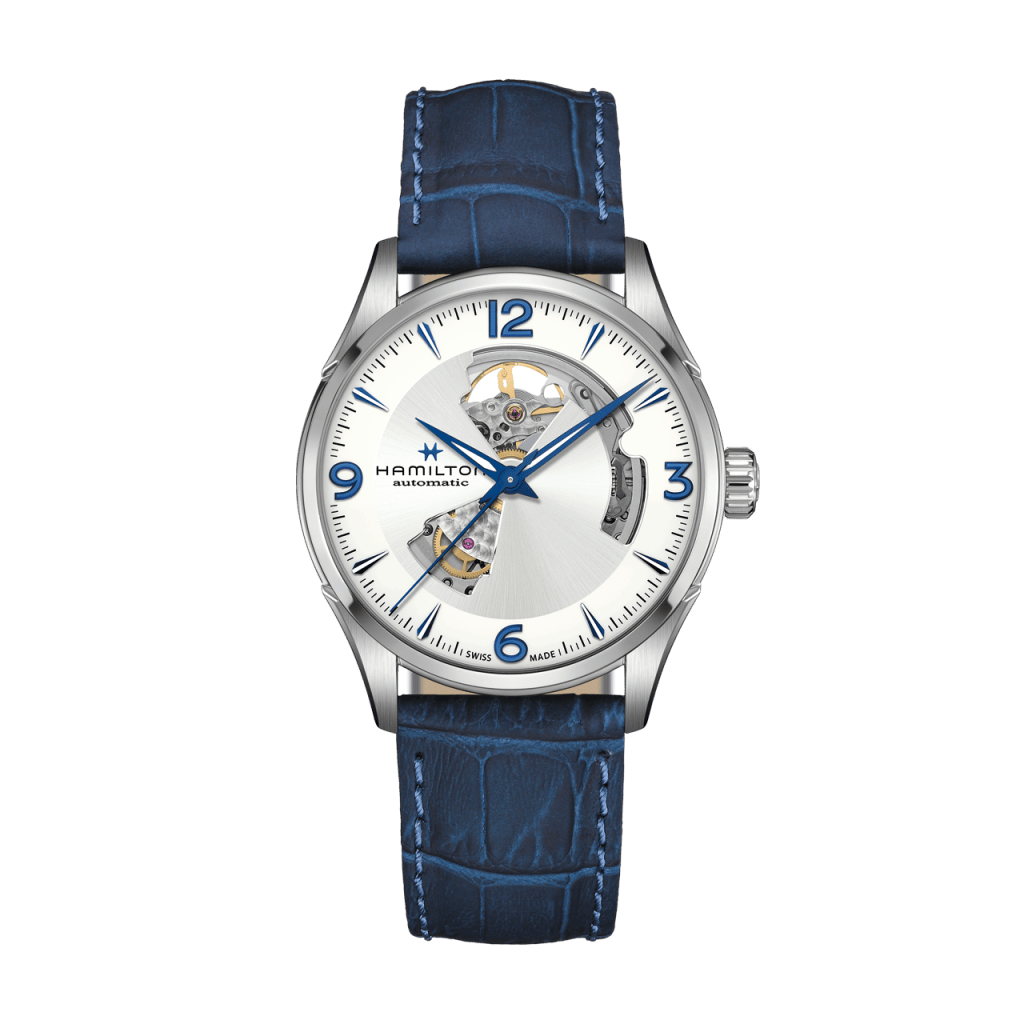 伝統と革新が融合した「ジャズマスター オープン ハート」。美しいシルバーダイヤルに映えるブルーのインデックスと針。精巧にカットアウトされたダイヤルからは、スイスメイドの自動巻きムーブメントが正確に時計を刻み続ける様子を堪能することができます。洗練された個性を表現する同系色のブルーストラップか、落ち着いた雰囲気のステンレススチールブレスレットをお選びいただけます。