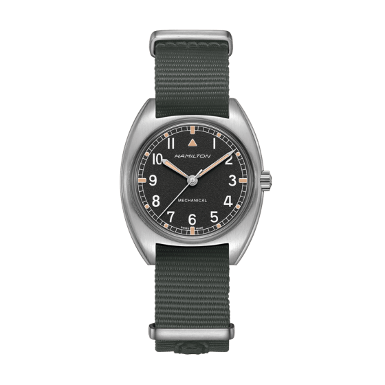 手巻きムーブメントH-50を採用し、80時間の標準持続時間を備えた「カーキ パイロット パイオニア メカ」。1973年に英国空軍のために製造されたヴィンテージのミリタリーウォッチを復刻。特徴的なダイヤルとラギッドなNATOストラップを備えた真のミリタリースピリットを宿す時計です。