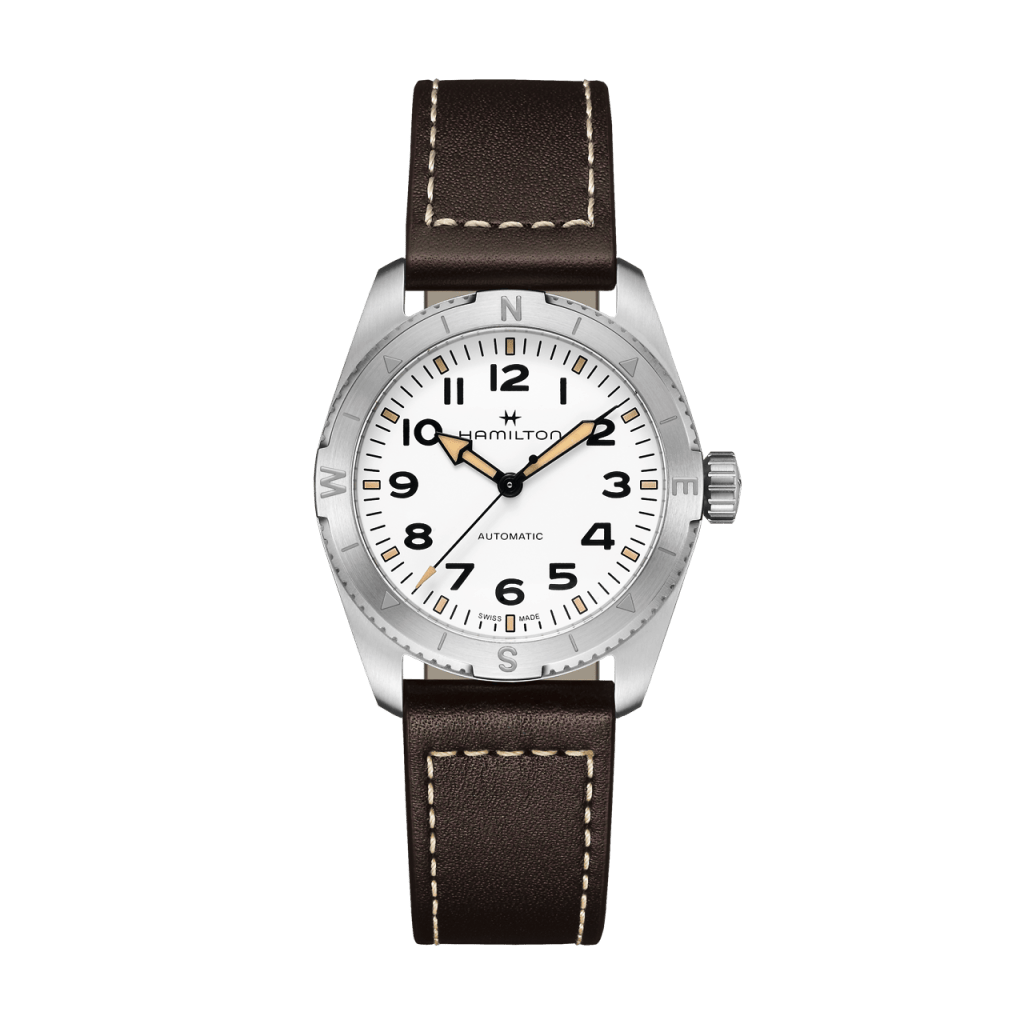 大自然へと誘う「カーキ フィールド エクスペディション」は、どんな場所にも適応するアドベンチャーウォッチ。コンパスのデザインが、太陽が頼りとなる冒険の旅で進むべき道を示してくれます。37mmのステンレススチール製ケースと、ブラウンレザーストラップ、さらにムーブメントを悪天候から守るねじ込み式リューズを備えています。質感のあるホワイトダイヤルに、視認性に優れるスーパールミノバ®加工を施した「カーキ フィールド エクスペディション」は、いかなる状況下でもタフさを発揮します。