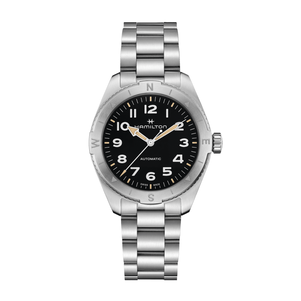 大自然へと誘う「カーキ フィールド エクスペディション」は、どんな場所にも適応するアドベンチャーウォッチ。コンパスのデザインが、太陽が頼りとなる冒険の旅で進むべき道を示してくれます。41mmのステンレススチール製ケースと、ケースにマッチするブレスレット、さらにムーブメントを悪天候から守るねじ込み式リューズを備えています。質感のあるブラックダイヤルに、視認性に優れるスーパールミノバ®加工を施した「カーキ フィールド エクスペディション」は、いかなる状況下でもタフさを発揮します。