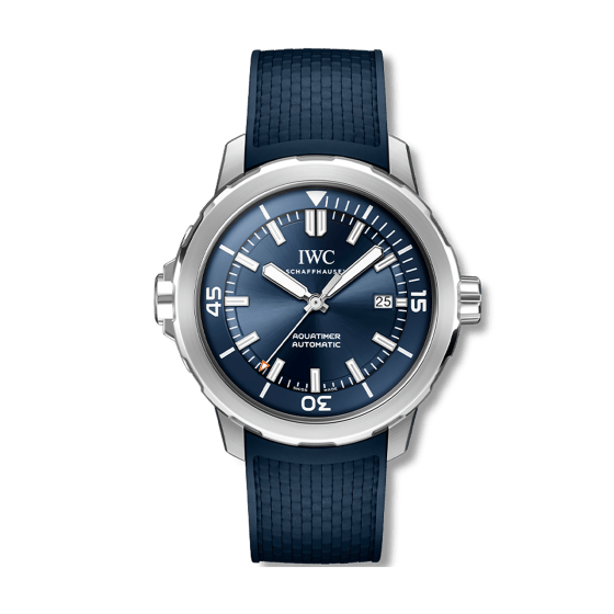 堅牢な構造と急激な気圧変化への適応、優れた視認性と革新的な技術機能。これらは、IWCが1967年より製造しているダイバーズ・ウォッチ「アクアタイマー」の最大の特長であり、プロフェッショナルおよびアマチュアダイバー双方に愛される理由でもあります。「アクアタイマー・オートマティック」は、30気圧防水で、直径42mmの腐食に強いステンレススティール製ケースを備えたダイバーズ・ウォッチです。ブルーの文字盤に配置されたダイビング用表示には夜光塗料が塗布され、水中でも優れた視認性を提供します。ケース内部で鼓動を刻むのは、IWC自社製キャリバー32111。この自動巻きムーブメントが120時間のパワーリザーブを蓄えます。また、革新的な回転式アウター/インナーベゼルが、使いやすさと安全な潜水を実現します。アウターベゼルの回転は、スライディング・クラッチシステムを通してインナーベゼルへと伝達されます。セーフダイブ・システムにより、潜水時間の目盛りが付いたインナーリングが常に反時計回りに回転する仕組みになっているため、誤った調整をした場合でも潜水時間の限界を超過することがなく、常にダイバーの安全が守られます。IWCのクイック交換システムにより、ブルーのラバー・ストラップをブレスレットに簡単に交換していただくことが出来ます。アクセサリー時計をパーソナライズする幅広いアクセサリーが揃っています