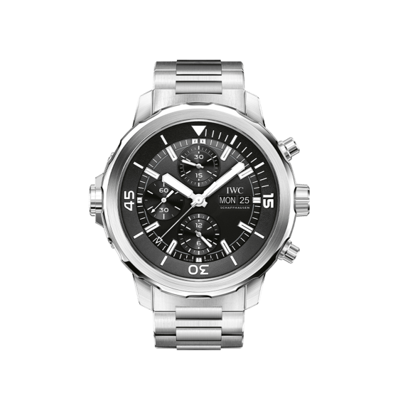 控えめなフォルムと色合いでシンプルを極めた文字盤デザインは、1967年の初代「アクアタイマー」の外観を現代的にアレンジしたものです。クロノグラフ機能では単独タイムと最長12時間までの総合タイムの計測が可能で、長時間にわたる潜水でも信頼が置けます。スレートカラーの文字盤は、3つのサブダイヤルと日付・曜日表示を備えながらも、すっきりとした印象を与えます。機械式回転式アウター/インナーベゼルには、ダイビング時間が誤って変更されることを防ぐセーフダイブ・システムが搭載されています。30気圧までの防水性と合わせ、非常に実用性の高いダイバーズ・ウォッチです。「9時」位置にあるクラッチシステムのカバーも、全体のイメージにぴったりと調和しています。直径44mmのステンレススティール製ケースには、44時間のパワーリザーブを備える堅牢なクロノグラフ・ムーブメント、キャリバー79320が収められています。このタイムピースはステンレススティール製ブレスレットでご用意します。