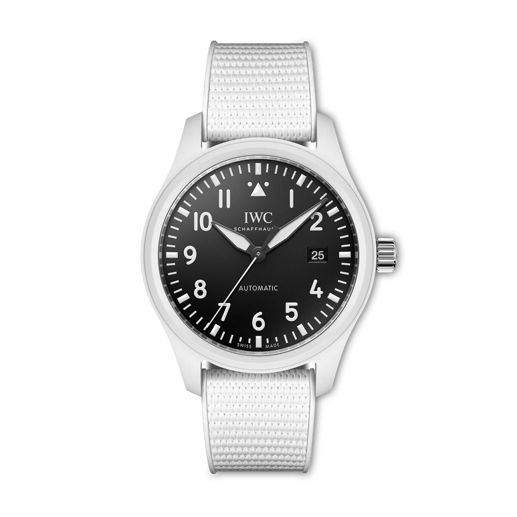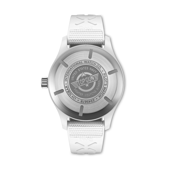 「パイロット・ウォッチ・オートマティック 41 トップガン “レイク・タホ”」は、41mmの印象的なホワイトセラミック製ケースを備えています。このセラミックのカラー「レイク・タホ」は、タホ湖周辺の冬景色からインスピレーションを得たもので、この地は近隣にある「アメリカ海軍戦闘機戦術教育プログラム(SFTI)」の訓練地として頻繁に利用されています。この独特で落ち着いたホワイトの色調は、IWCシャフハウゼンを代表するセラミックカラーのひとつとして定着しています。ホワイトセラミックは、酸化ジルコニウムに他の金属酸化物を精密に定められた割合で混合し、複雑な工程を経て製造されます。この粉末は、まず「グリーンボディ」と呼ばれる成形前体に加工され、最終的な形状に近づけるために機械加工されます。その後、ケースは炉で焼成処理されます。このいわゆる「焼結」プロセスを経ると、セラミックの硬度はビッカース硬度で約1300という数値に達し、極めて高い硬度と耐傷性を誇る素材となります。ホワイトセラミック製ケースにはホワイトの分目盛とインデックスがプリントされた漆黒の文字盤が組み合わされており、数字とアップライトインデックス、ブラックの針にはスーパールミノバ®を塗布して完璧な視認性を確保しています。チタン製ケースバックには、象徴的な「TOP GUN」のロゴを刻印。この時計の心臓部は、IWC自社製キャリバー32112で、双方向爪巻き上げ機構を採用しており、主ゼンマイに120時間のパワーリザーブを効率よく蓄えます。「パイロット・ウォッチ・オートマティック 41 トップガン“レイク・タホ”」には、スティール製ピンバックル付きのホワイトラバーストラップが装着されています。
