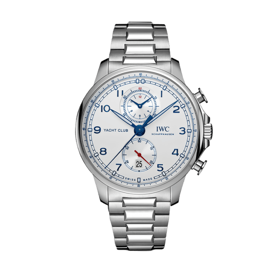 「ポルトギーゼ・ヨットクラブ・クロノグラフ」は、時代に左右されない洗練されたエレガンスを湛えた、航海に適したスポーツウォッチです。強靭さや6気圧という高い防水性をも兼ね備えており、船上やビーチ以外でも様々なシーンで広く大活躍するモデルです。繊細なベゼルとフラットなケースリングを備え、直径44mmのステンレススティール製ケース全体のバランスがさらに優雅になりました。このスポーティーなクロノグラフの文字盤には、特徴的な分目盛りやアラビア数字のアップライト・インデックスなど、「ポルトギーゼ」特有のデザインが採用されています。このモデルにはシルバーメッキの文字盤にブルーの針とアップライト・インデックスが組み合わされています。フライバック機能を搭載したIWC自社製キャリバー89361が、「12時」位置のサブダイヤルに統合されたアワー・カウンターとミニッツ・カウンターで計測タイムを表示し、68時間のパワーリザーブを蓄えます。また、表面にポリッシュ仕上げとサテン仕上げを施した高品質ステンレススティール製ブレスレットが、快適な装着感を提供します。